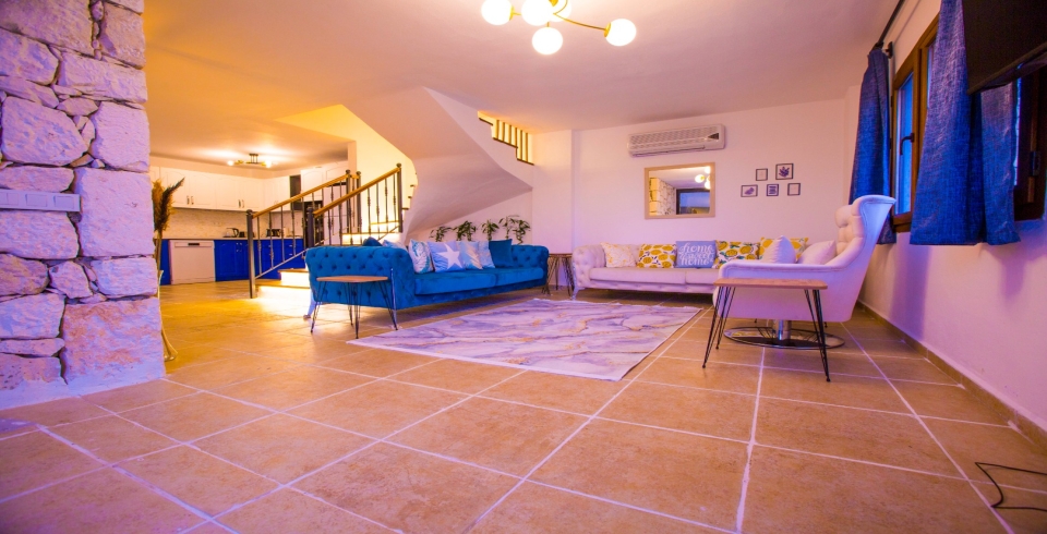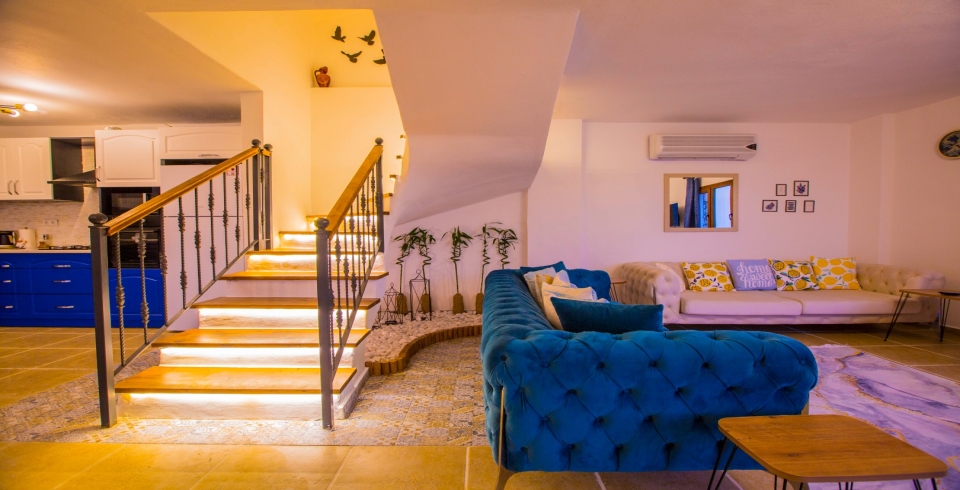 Villa Amore is located in the Ortaalan area of Kalkan. It is a spacious villa with 4 bedrooms that can accommodate up to 8 guests, making it highly suitable for larger groups and families. All of the bedrooms feature sea-facing balconies with swinging seats, allowing guests to enjoy the stunning views. The villa's rooftop terrace is a highlight, boasting an open-air jacuzzi, a pergola-shaded outdoor seating area, and a kitchenette. This is the perfect spot to enjoy morning coffees or evening drinks while taking in the beautiful vistas. The villa's interiors are modern, with a well-equipped kitchen and a dining area. The sun terrace is spacious, providing ample space for guests to relax and soak up the sun. Villa Amore is situated just a 15-20 minute walk or a 3-4 minute taxi drive from the Kalkan town centre, making it conveniently located for exploring the local area.
