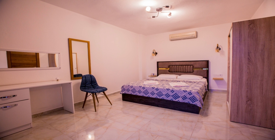3. Bedroom : A double bed, bedside table, air conditioning, wardrobe, vanity table, bathroom and WC.