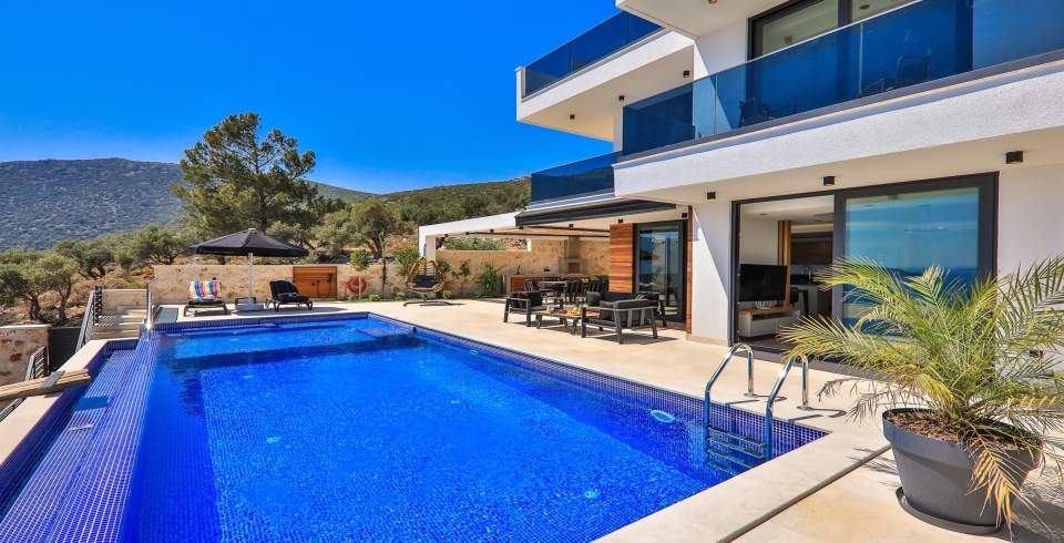 Villa Eos has beautiful, stylish and contemporary design, located in an elevated position in the Kalamar Bay area of Kalkan. Designed to accommodate a group or family of 6, this property has three elegant bedrooms, each with a private balcony so you can take in the scenery at dawn or dusk, private 10m infinity pool, an outdoor kitchenette and BBQ area, table tennis and rooftop Jacuzzi. We are delighted to be able to offer our guests the opportunity to stay at this outstanding property in Kalamar, close to beach clubs, shops and bars in the area and about a 25 minute walk to the old town.