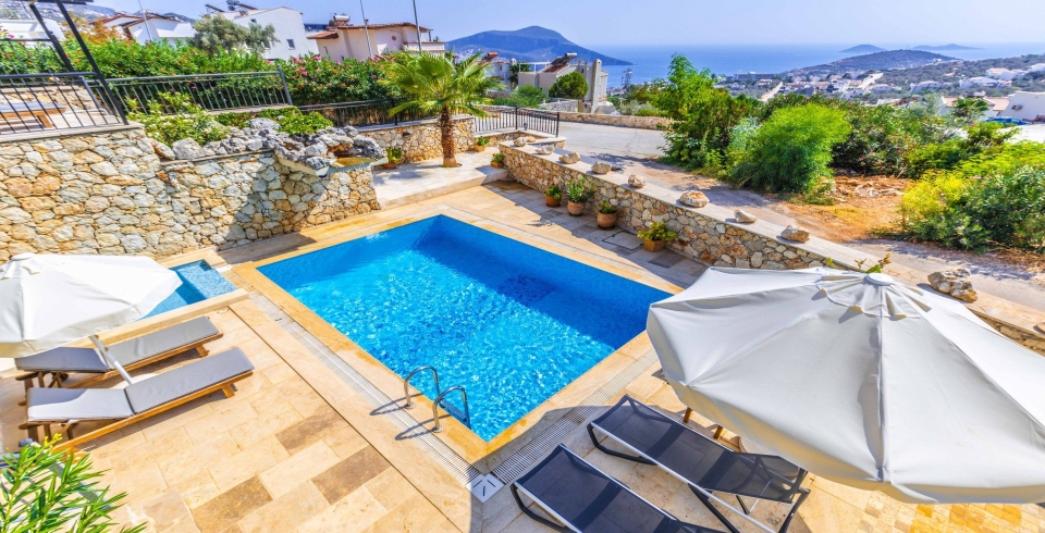 Villa Luis is located in the serene Kiziltas district of Kalkan. This lovely villa houses 4 bedrooms and 3 bathrooms, with 2 of the bedrooms featuring balconies that offer sea views. The living area is beautifully designed and the kitchen is equipped with everything you need. The outdoor area features a spacious pool terrace, complete with a swimming pool, children's pool and a delightful waterfall cascading into the pool. On the right side of the property, you'll find an Ottoman corner and dart area. A separate pergola-shaded al fresco dining space, along with a stone BBQ, is conveniently located above the pool terrace. Accessible from the dining area, the rooftop terrace offers Ottoman-style cushioned outdoor seating, perfect for relaxation. The town centre is conveniently accessible within a 20-25 minute walk or a swift 3-4 minute drive. For any immediate necessities, the 'Kanga' supermarket is just a 3-4 minute walk away from the villa.