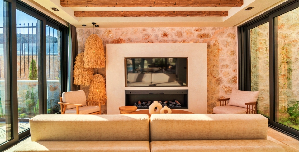 Villa Muses Calipoe is one of four new villas that combine the best of traditional Turkish Mediterranean design with contemporary comfort and convenience. The property boasts a plethora of characterful spaces, ideal for unwinding and enjoying the surrounding sea views. The accommodation is arranged over two floors, with one twin room and two double rooms with king-size beds, all en-suite. The master bedroom is a spacious ground floor room with sliding doors leading to the pool terrace and an indulgent freestanding bath. The use of wood and the high beamed ceilings are particularly attractive features, as are the tall windows and doors, which allow plenty of natural light to enter the room. The first floor comprises a double room with a large picture window that opens up the sea views to spectacular effect and a twin room. These rooms have access to a lovely wide stone and wrought iron balcony that expands into a circular sitting area. The ground floor comprises an open plan area comprising living and dining spaces and a kitchen fully equipped to self-cater. There's also a cinema room, WC and sauna on this level. The property benefits from a large picture window and glass doors that provide access to the swimming pool terrace, allowing for abundant natural light and an attractive connection between indoor and outdoor spaces. The property includes a private salt water swimming pool, six sunbeds, which can be arranged in various areas of the villa according to the owner's preference. The private swimming pool extends the majority of the front of the property, with a shallow sunbathing area at one end, which is ideal for keeping one's toes cool while relaxing.There is parking available outside the villa, and Kalkan's beach, old town and harbour are approximately five minutes away by taxi or hire car. There is also a local mini market close to the villa.