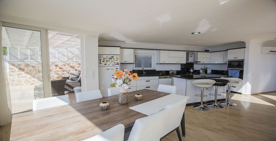 Three modernised open-plan kitchens are arranged for optimal usage in each separate apartment. Each fitted kitchen has the modern appliances you could desire from self-catering accommodation. When you want to dine in the cool air conditioning, an indoor dining table is featured next to the kitchen areas. In addition, the generous kitchen area is equipped with a dishwasher, washing machine, dining table, fridge freezer, toaster, microwave, kettle, oven and hob and all the utensils and dinnerware required for a self-catering holiday.