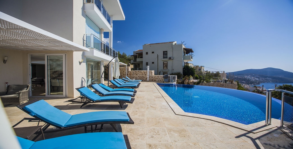 Villa Neptune is a 7 bedroom villa situated in the Kiziltas area of Kalkan, the villa looks out over both Kalkan and Kalamar Bays and is within a 4-5 minute drive to the Kalkan town center. On the ground floor is an open plan lounge, kitchen, dining area with large floor to ceiling glass doors which access the terrace and pool area. The ground floor also has one of the seven bedrooms, a double with ensuite and access to the terrace and pool. On the remaining floors are 6 further bedrooms with 2 roof top suites which have access to the roof terrace. Outside the villa is a stunning terrace with an infinity pool, the horizon seems to go on forever. There are sun loungers, a comfortable seating area and al fresco dining with a BBQ so you can stay in the villa and continue to enjoy the views. There is also a games room with a pool table and table tennis as well as some gym equipment for those of you who would like to continue your fitness routine.