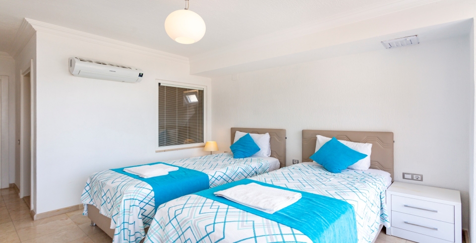 3. Bedroom: First Floor, Twin beds, bedside table, air conditioning, wardrobe, vanity table, bathroom and WC.