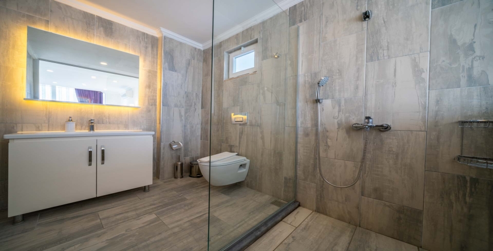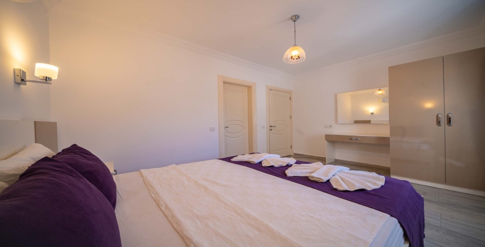 Bedroom 5 is the master room of the villa. It has one double and one single bed with an en-suite shower room, jacuzzi bath, bedside tables, a wardrobe, and a vanity table. The sliding glass doors lead out onto the top-floor terrace. It is furnished with two sun loungers, chairs and a table. Guests can enjoy the outstanding views of Kalkan Bay.