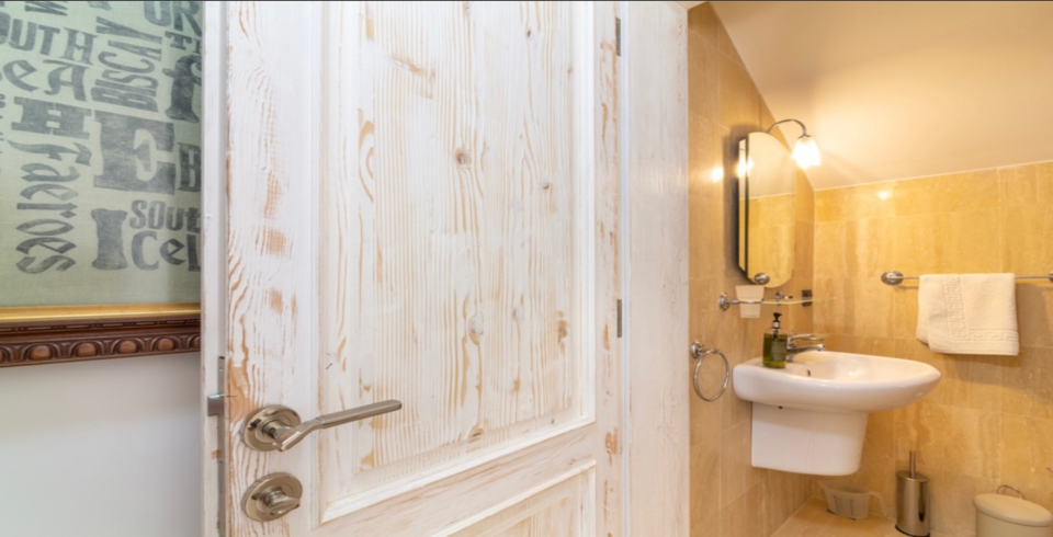 Stone stairs from the large living room lead one to an indoor place where people can eat. This area has a dining table for ten people. It's perfect for when the family gets together, for slow lunches, and for dinners when the sun is going down. Right next to this is a large kitchen that shares the open space. From everywhere in the kitchen, sea vistas can be seen. The kitchen features a dishwasher, washing machine, fridge freezer, microwave, kettle, oven, hob, and all the utensils required during your self catering stay.